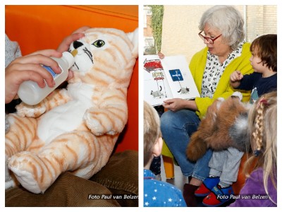 Ook in kinderdagverblijf Het Zandkasteel in Vlissingen werd voorgelezen. Op verzoek van de leidsters las een vrijwilligster van ons dierenasiel het verhaal van kater Harry. Er werd door de peuters volop meegeleefd met het katertje, dat na een heleboel avonturen zijn huis gelukkig weer terugvond. Dat de groep al wekenlang bezig was met het thema kat was goed te merken. De kinderen haalden de poezenknuffels, die ter illustratie waren meegebracht, enthousiast uit de vervoersmand en er werd volop geaaid en geknuffeld! Hoogtepunt was wel het geven van een flesje aan een babypoes, wat de peuters met overgave deden. Er werd afgesloten met de overhandiging van een mooi kunstwerk dat door de kinderen was gemaakt én een vrolijk liedje over kater Harry.